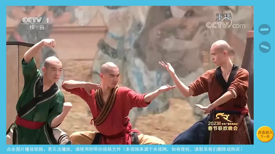 ——刚刚我们看到的是中国武术。你们觉得哪个武术动作最厉害?请你试着来做一做。