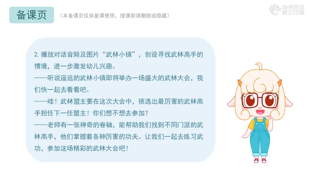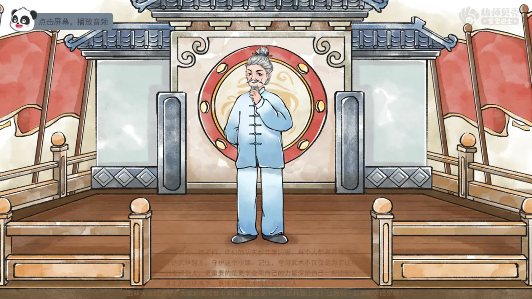 2.播放对话音频及图片“武林小镇”,创设寻找武林高手的情境,进一步激发幼儿兴趣。