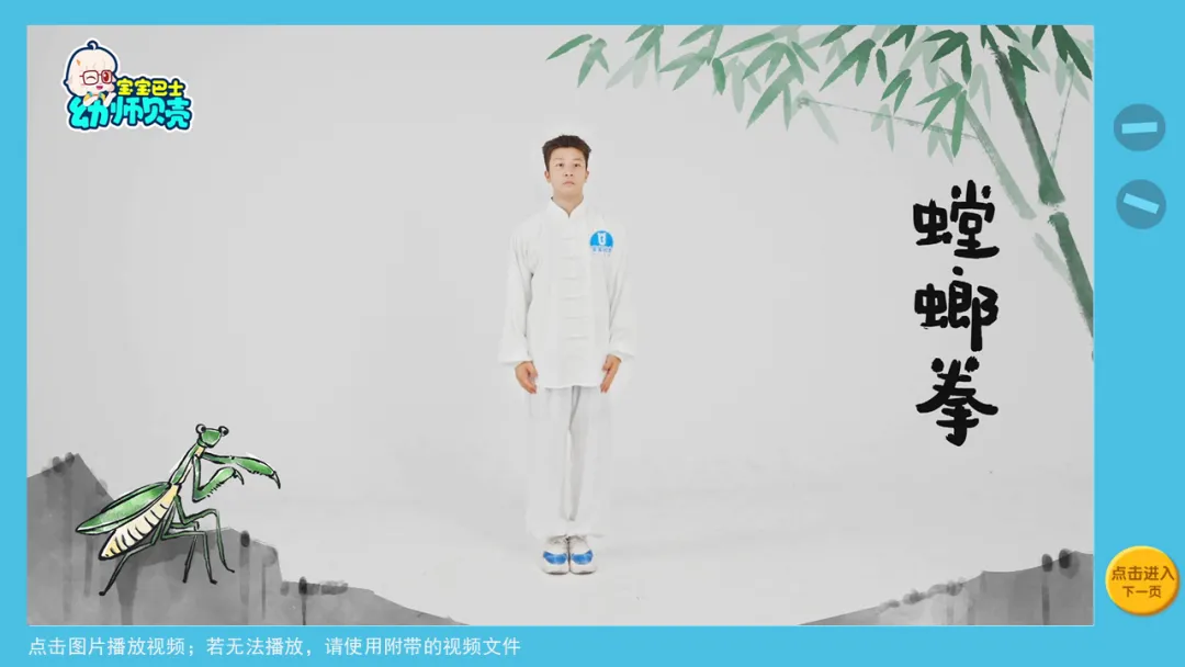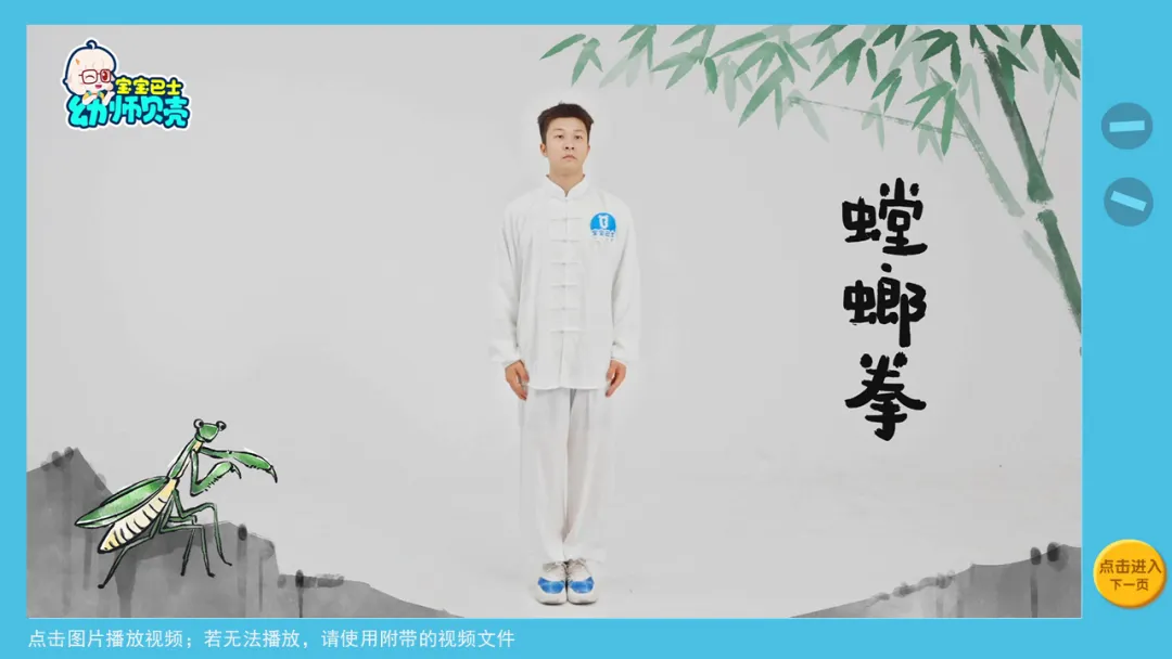 1)出示图片“寻找武林高手”、播放实拍视频《螳螂拳》,引导幼儿初步了解螳螂拳,感受其迅猛有力的动作特点。