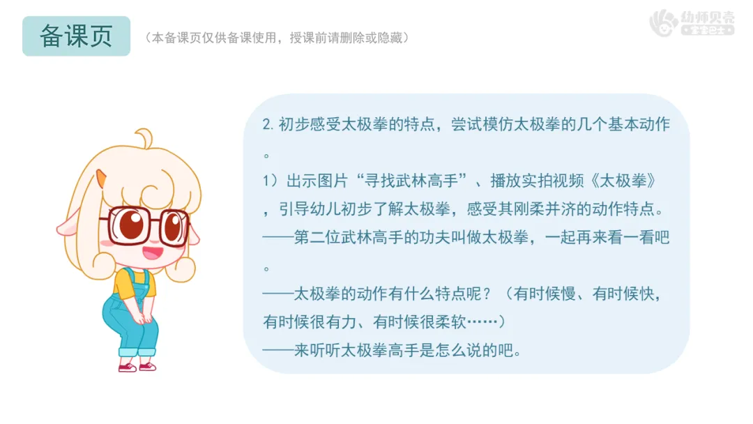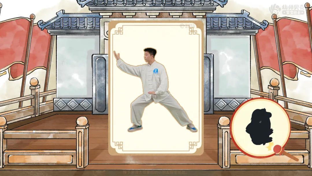 1)出示图片“寻找武林高手”、播放实拍视频《太极拳》,引导幼儿初步了解太极拳,感受其刚柔并济的动作特点。