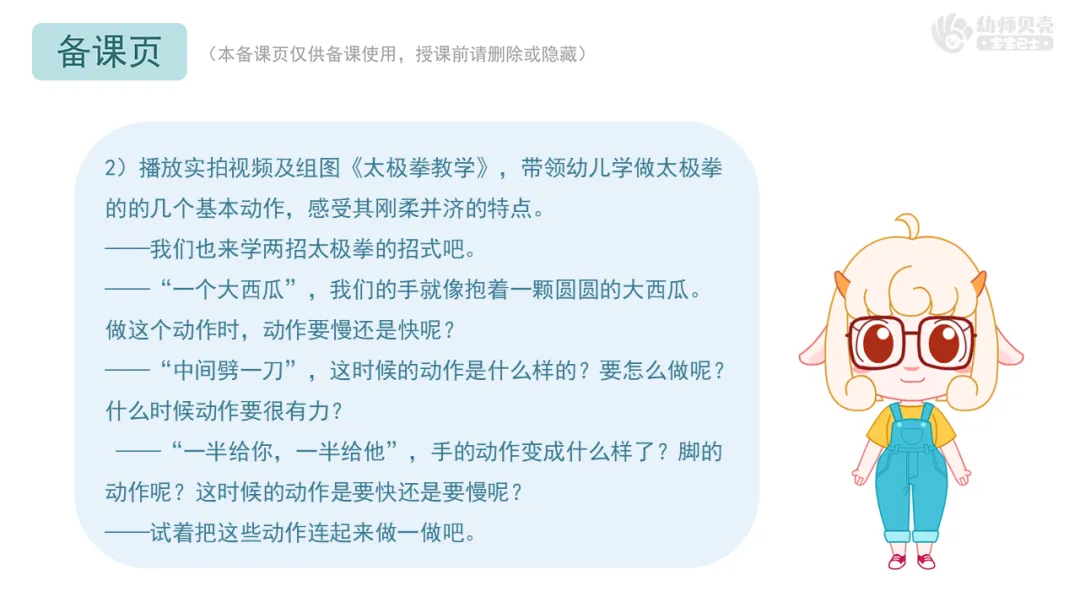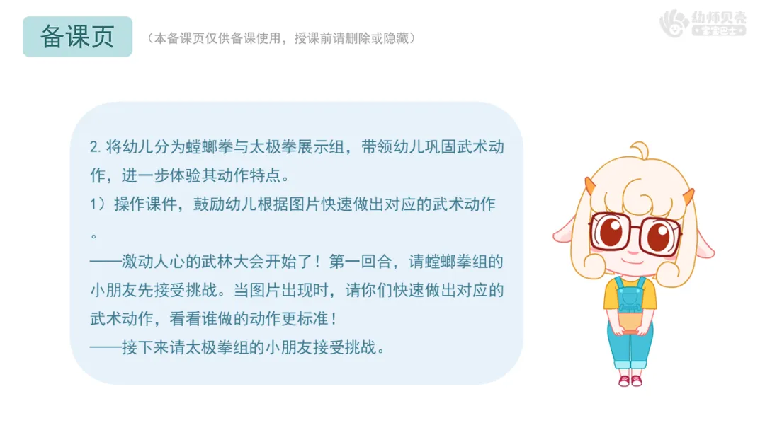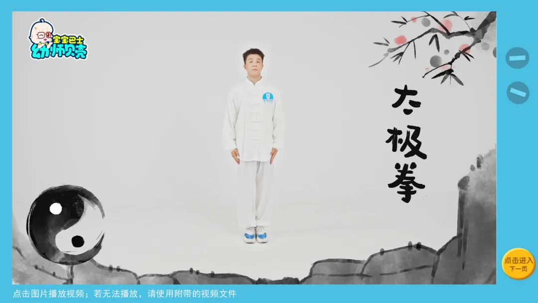 1)操作课件,鼓励幼儿根据图片快速做出对应的武术动作。