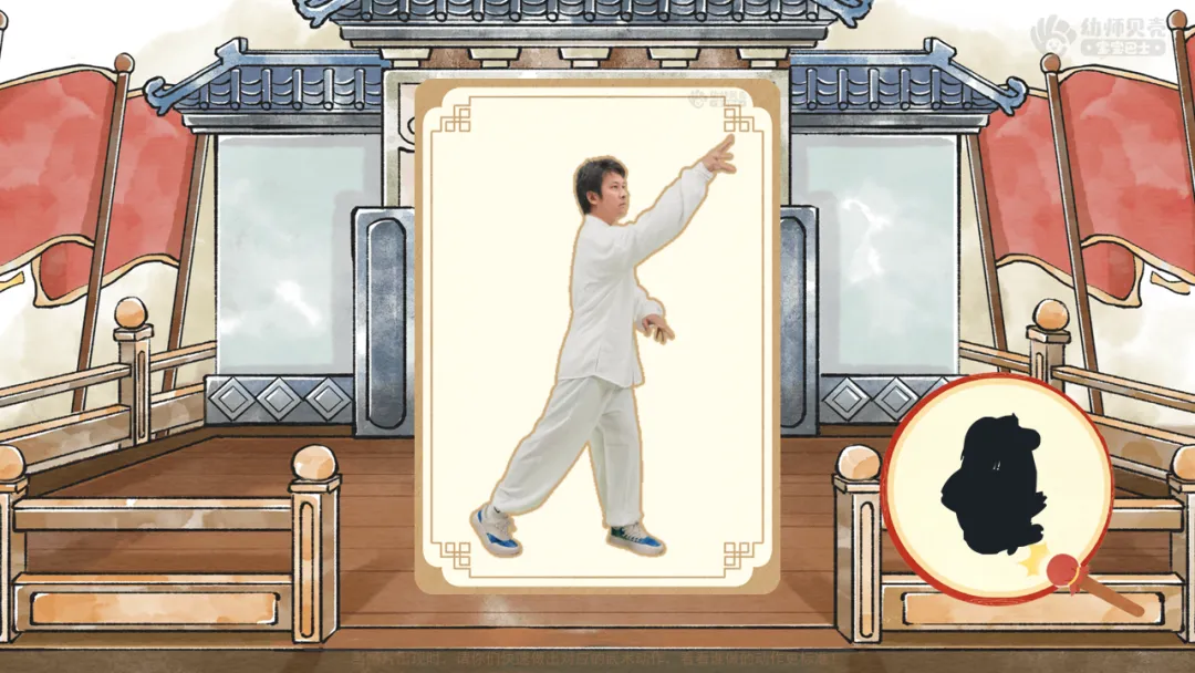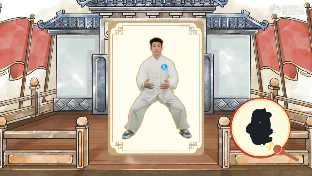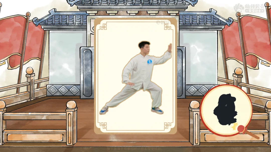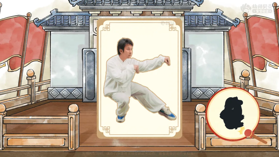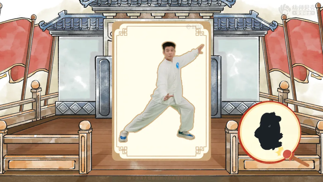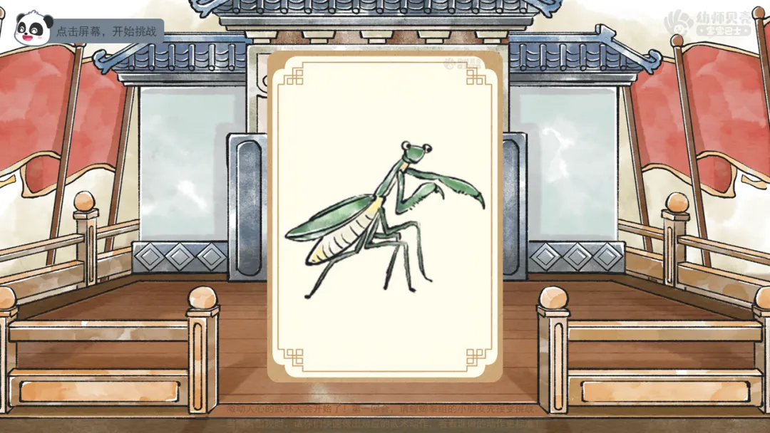 ——激动人心的武林大会开始了!第一回合,请螳螂拳组的小朋友先接受挑战。当图片出现时,请你们快速做出对应的武术动作,看看谁做的动作更标准!
