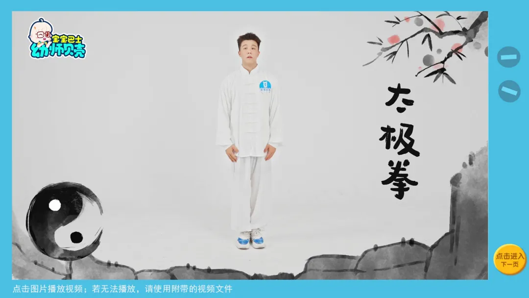 2)播放实拍视频及组图《太极拳教学》,带领幼儿学做太极拳的的几个基本动作,感受其刚柔并济的特点。