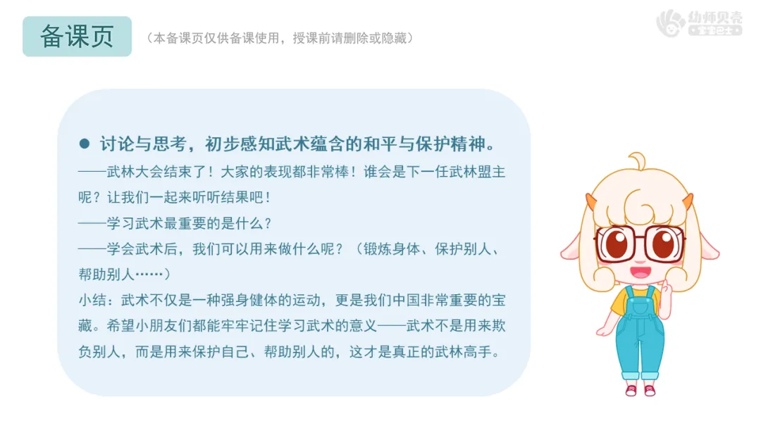 l讨论与思考,初步感知武术蕴含的和平与保护精神。
