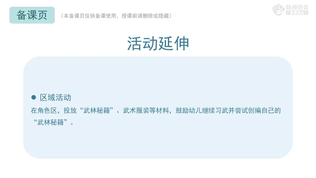 在角色区,投放“武林秘籍”、武术服装等材料,鼓励幼儿继续习武并尝试创编自己的“武林秘籍”。