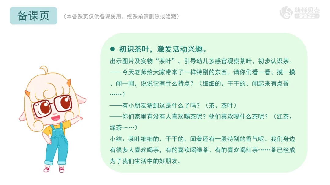 l经验准备:幼儿在家中见过家人喝茶,知道家人所饮用茶的名称。
