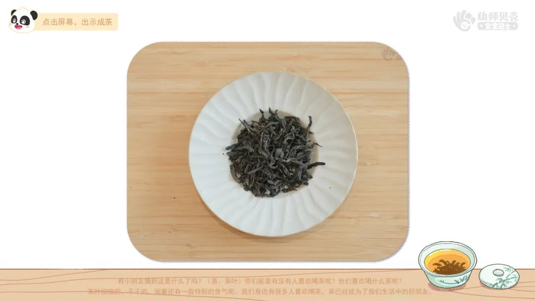 出示图片及实物“茶叶”,引导幼儿多感官观察茶叶,初步认识茶。