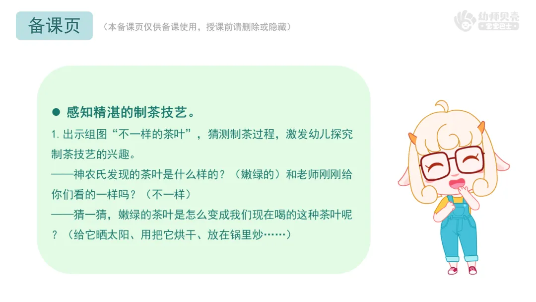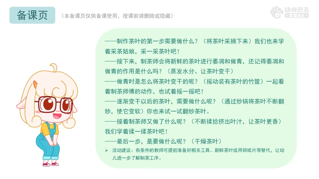 Ø活动建议:有条件的教师可提前准备好相关工具、新鲜茶叶或用碎纸片等替代,让幼儿进一步了解制茶工序。