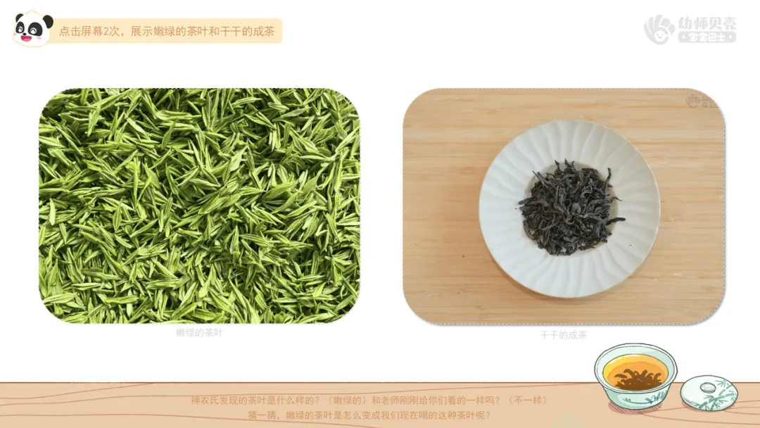 ——神农氏发现的茶叶是什么样的?(嫩绿的)和老师刚刚给你们看的一样吗?(不一样)