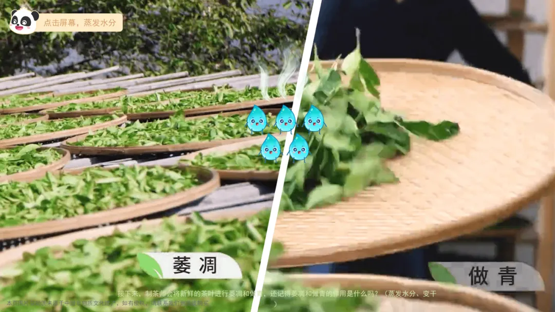 ——接下来,制茶师会将新鲜的茶叶进行萎凋和做青,还记得萎凋和做青的作用是什么吗?(蒸发水分、让茶叶变干)
