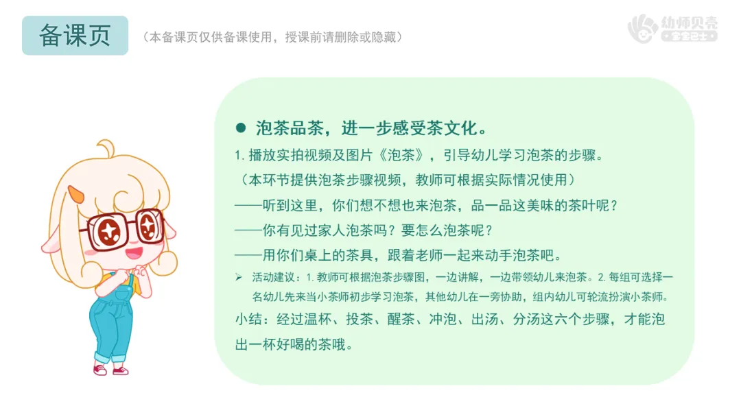 Ø活动建议:1.教师可根据泡茶步骤图,一边讲解,一边带领幼儿来泡茶。2.每组可选择一名幼儿先来当小茶师初步学习泡
