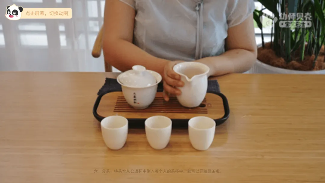 ——接下来,请你们用上茶礼仪,再来和同伴一起来品茶吧!