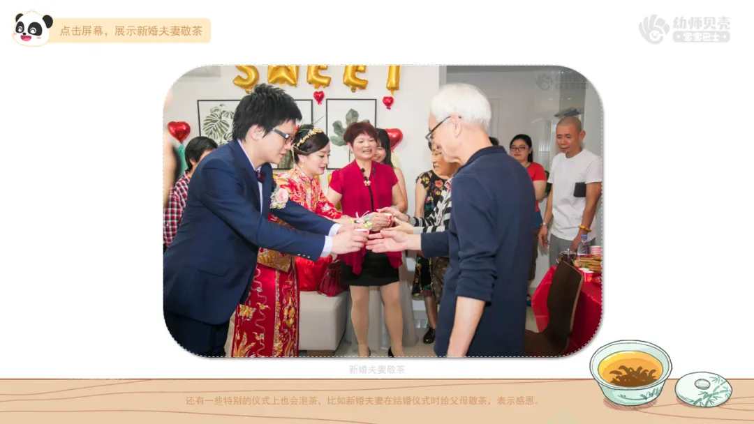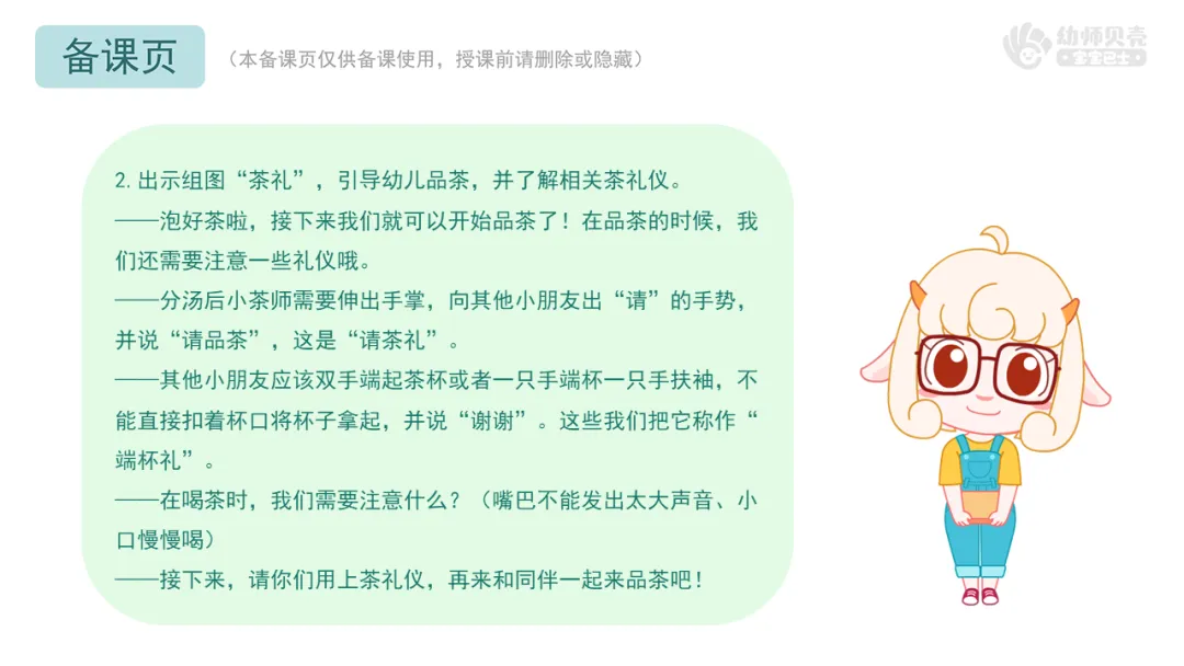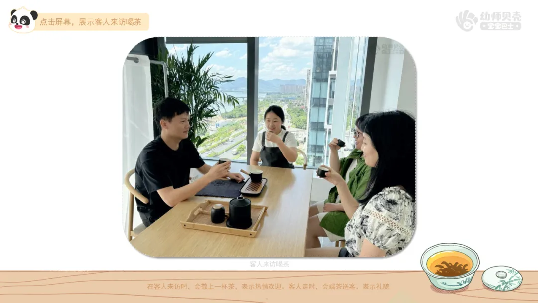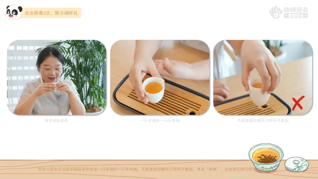 ——其他小朋友应该双手端起茶杯或者一只手端杯一只手扶袖,不能直接扣着杯口将杯子拿起并说“谢谢”。这些我们把它称作“端杯礼”。