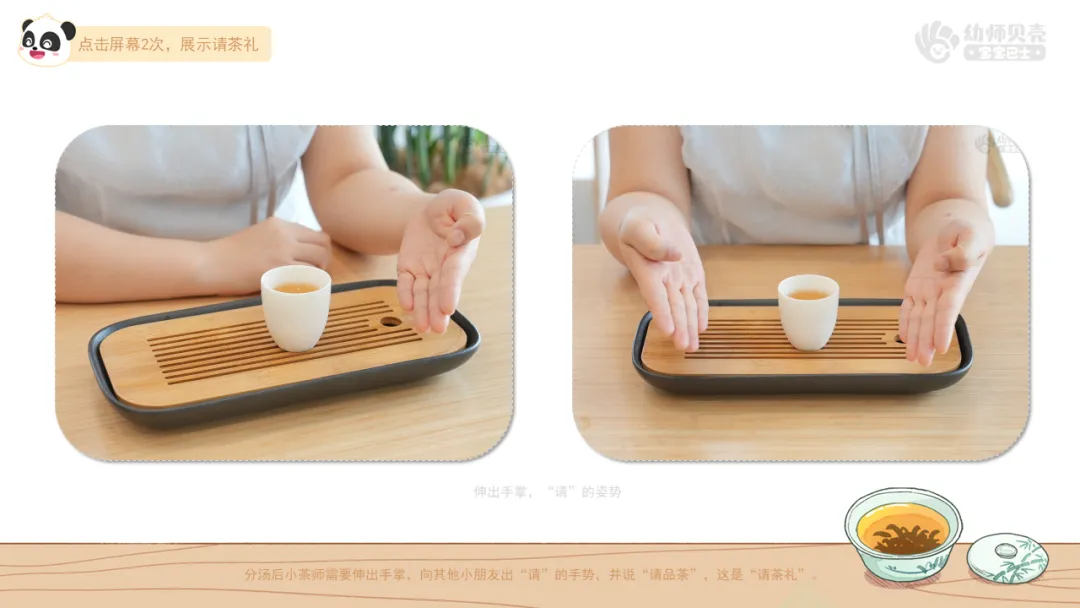 ——分汤后小茶师需要伸出手掌,向其他小朋友出“请”的手势,并说“请品茶”,这是“请茶礼”。