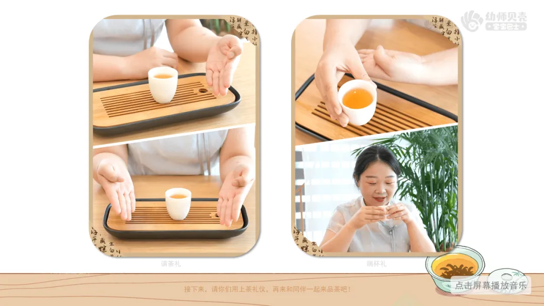 2.出示组图“茶礼”,引导幼儿品茶,并了解相关茶礼仪。