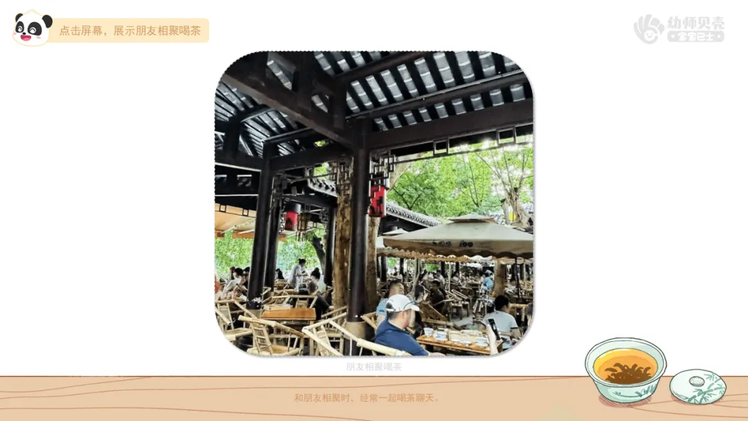 3.出示组图“茶文化”,鼓励幼儿联系生活,分享日常饮茶场景,进一步感受中国茶文化。