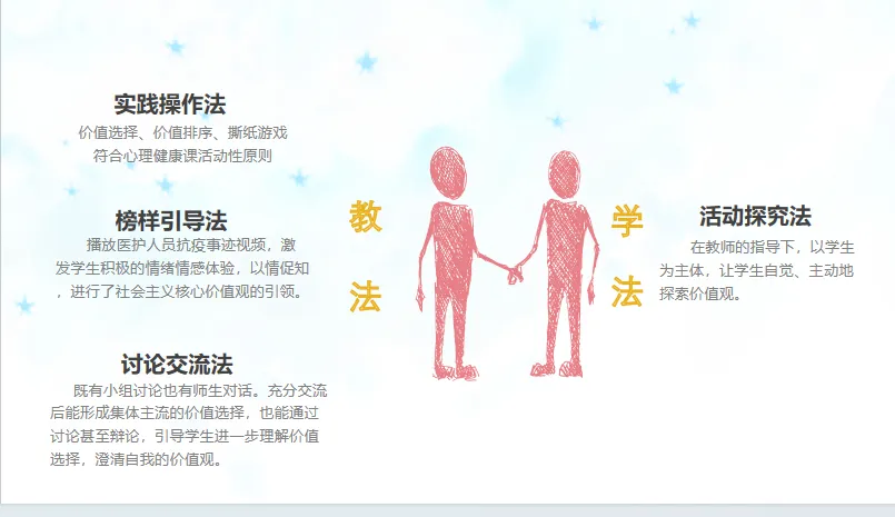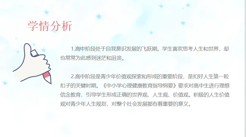 今天搞到了,这是我们江苏省心理年会时我印象中一位女老师上的一节示范课,具体时间记不得了。江苏每年心理都有年会,以前有示范课、工作坊、专家报告,还是吸引了不少同行去学习的,每年在不同的市开展,那时我不带儿子都是调课请假也要参加学习的。感兴趣明年可以参加,不过要交会务费,管饭,住宿自己回单位报销,这里特别感谢前几任领导支持我们出去学习!接下来给大家搞到的高中这节省心理年会的示范课介绍如下:当时没有给教案和课件,但有上这节课的说课稿课件部分截图如下其实这个比教案和课件还要好,因为告诉怎么设计的,为什么要这样设计。这节课设计的很巧妙,不论是设计理念还是学生现场的互动气氛都能称得上为一节优课,光看这整齐划一的礼服就知道多么用心了。当然分享给大家以及让更多心理同行看到是为了更好学习,提升自己,版权归江苏省心理年会主办方及上课老师所有,如有侵权联系删除。配推荐语分享至100人以上的2个心理或其他学习群或自己的朋友圈并点亮小爱心推荐,让更多的心理人看到。截图发给后台,别忘了先关注才能发给后台(若重复分享至同一群,则以先分享的为准,请诚信截图)分享百度网盘提取链接。如果您觉得不错,请点赞、转发给更多需要的同行朋友、小爱心