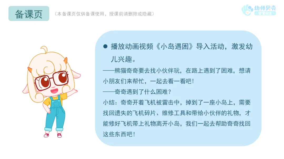 小结:奇奇开着飞机被雷击中,掉到了一座小岛上,需要找回遗失的飞机碎片、维修工具和带给小伙伴的礼物,才能修好飞机带上礼物离开小岛,我们一起去帮助奇奇找回这些东西吧!
