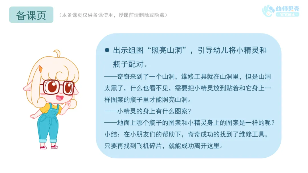 l出示组图“照亮山洞”,分发纸面教具《照亮山洞》,引导幼儿将小精灵和瓶子配对。