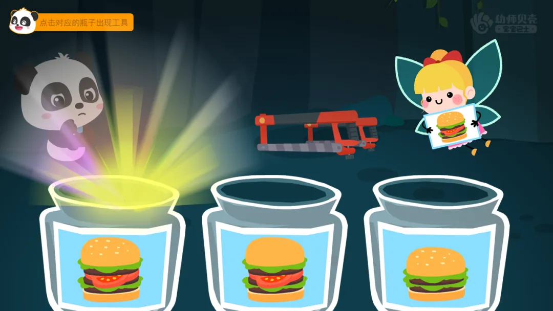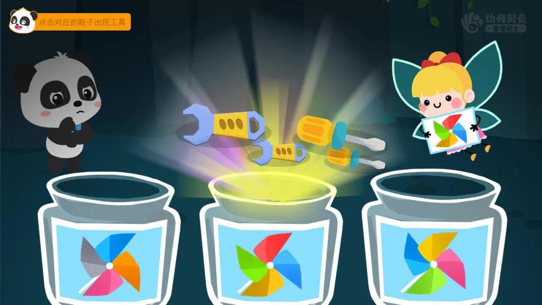 ——奇奇来到了一个山洞,维修工具就在山洞里,但是山洞太黑了,什么也看不见,需要把小精灵放到贴着和它身上一样图案的瓶子里才能照亮山洞。