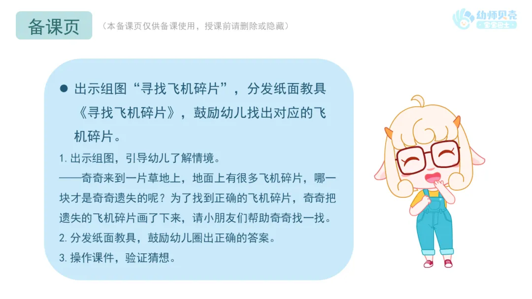 l出示组图“寻找飞机碎片”,分发纸面教具《寻找飞机碎片》,鼓励幼儿找出对应的飞机碎片。