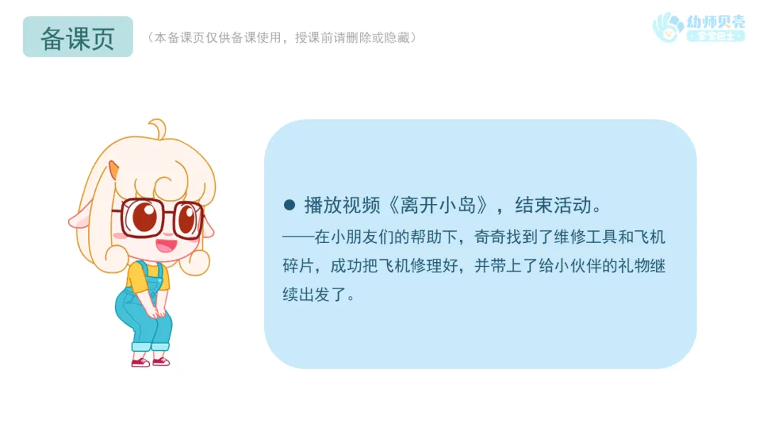 小结:礼物找到了,奇奇要继续寻找维修工具和飞机碎片,一起努力吧!