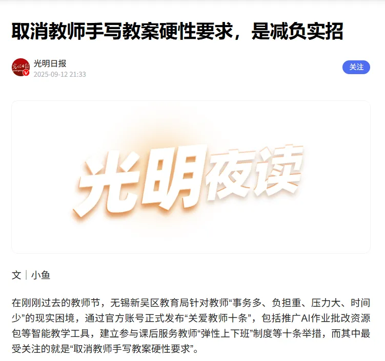 令人欣慰的是,更具前瞻性的变革已在一些地方破冰。近年来,已有教育专家公开质疑这一做法,更有如江苏无锡等地的教育部门率先明文取消对手写教案的硬性要求,这无疑是对形式主义的一次有力纠偏。它传递出一个清晰信号:教育管理应信任教师的专业自主性,其核心任务是“赋能”而非“束缚”。