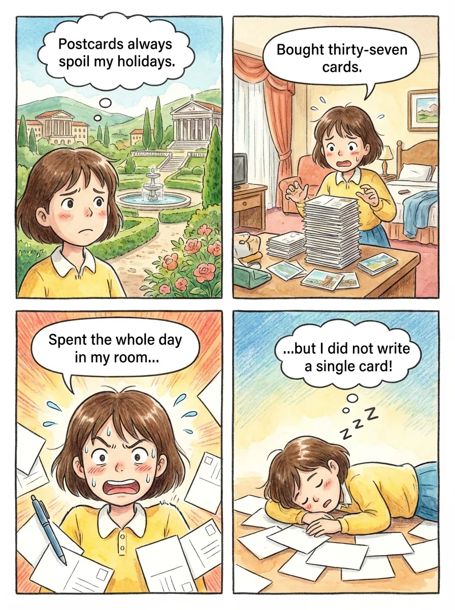 3. 呼应 (第十一句,也是最后一句):以"一整天,却一张没写"的强烈反差,生动地呼应了开头的"明信片毁了假期",形成首尾呼应的闭环,极具戏剧性和幽默感。