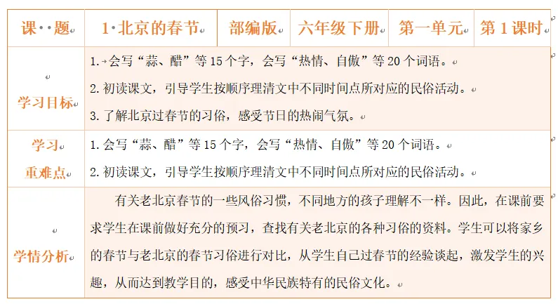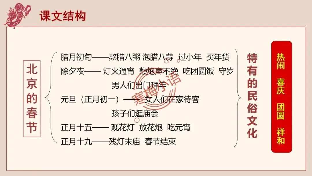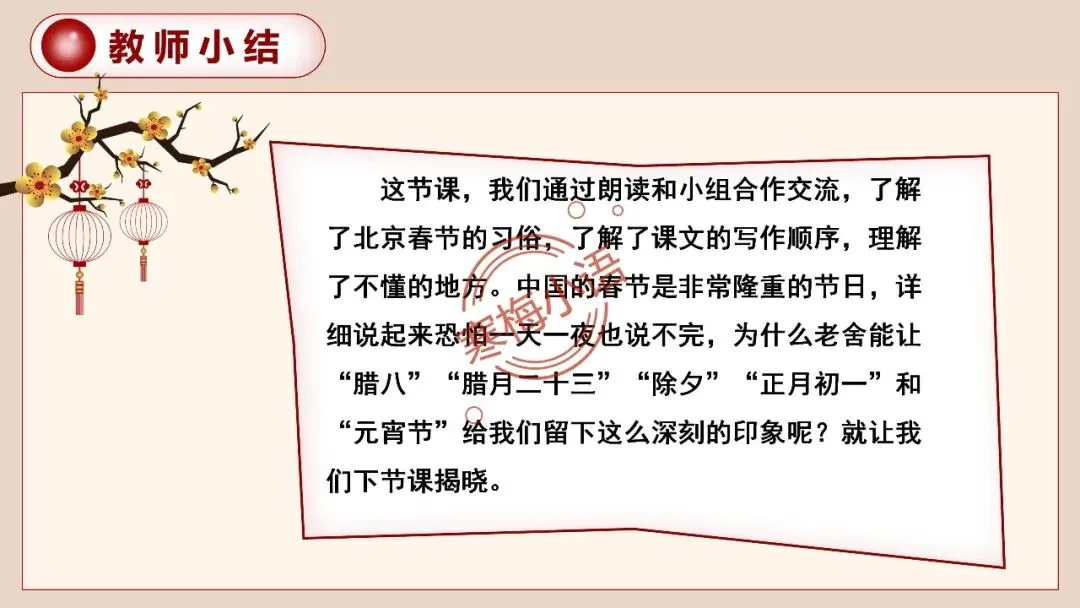 这节课,我们通过朗读和小组合作交流,了解了北京春节那丰富多彩的风俗习惯,也初步了解了课文的写作顺序。希望大家回去再美美地朗读课文,并把你喜欢的段落多读几遍。下节课,我们将深入了解北京春节那浓浓的 “年味”,学习作者的写作方法。