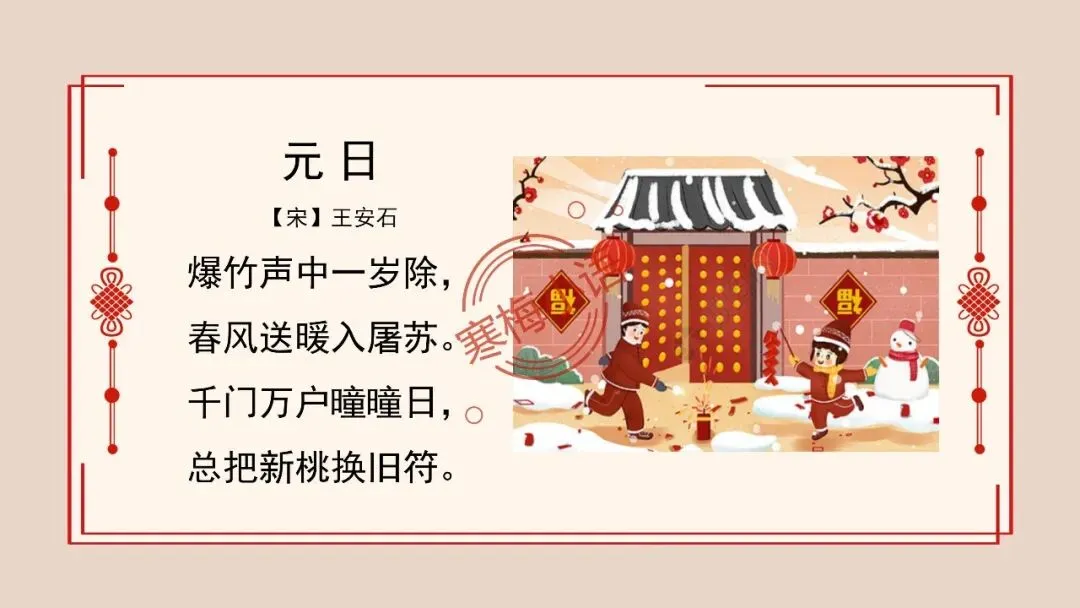 3.师:(课件出示:爆竹声中一岁除,春风送暖入屠苏。)这两句诗描写的是什么节日?(板书:春节)在噼噼啪啪的爆竹声中,送走了旧年迎来了新年。人们饮美味的屠苏酒时,又有和暖的春风扑面而来,好不惬意!寒假里我们也刚刚过完春节,相信大家还历历在目,谁能来说一说你家是如何过春节的?