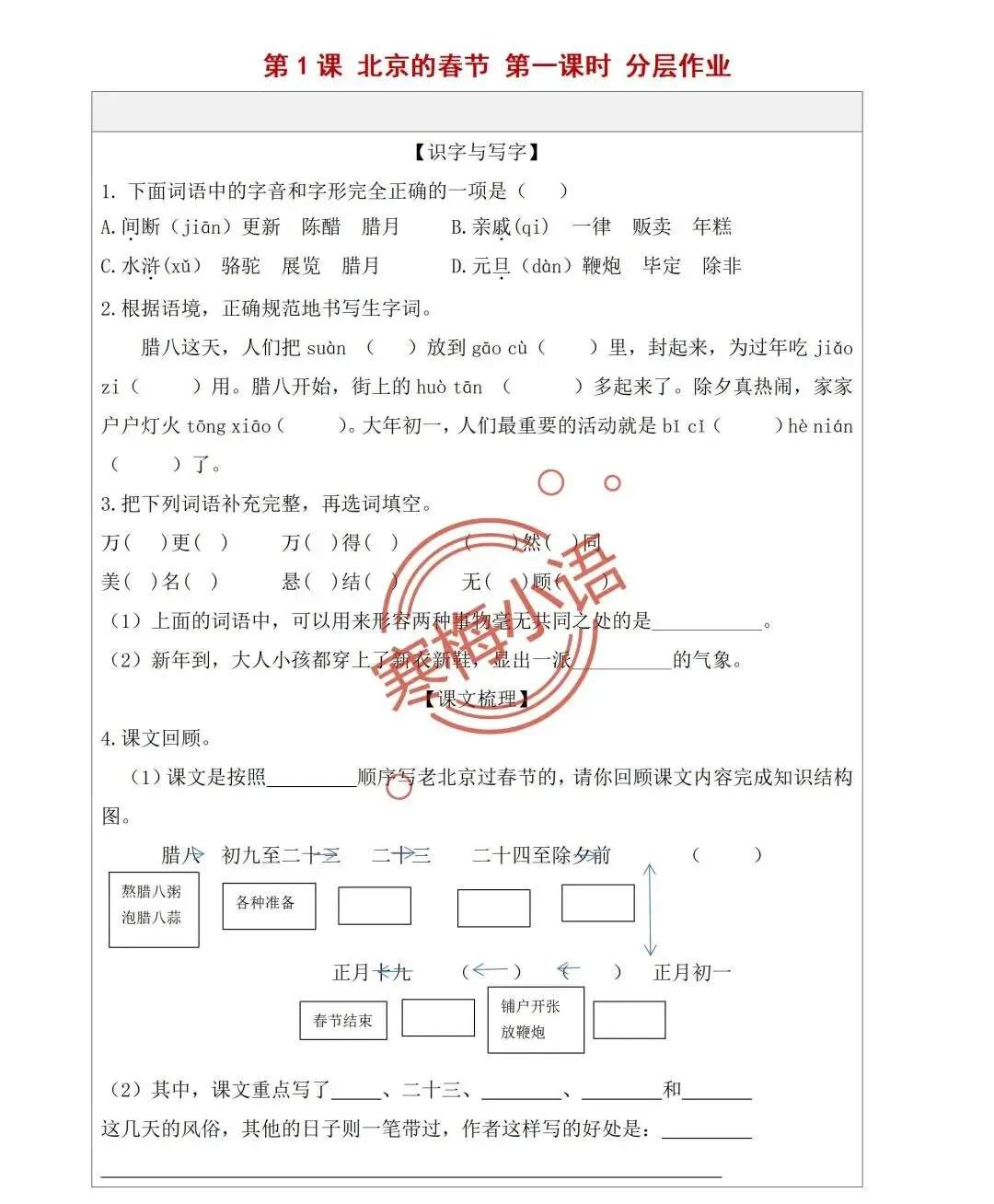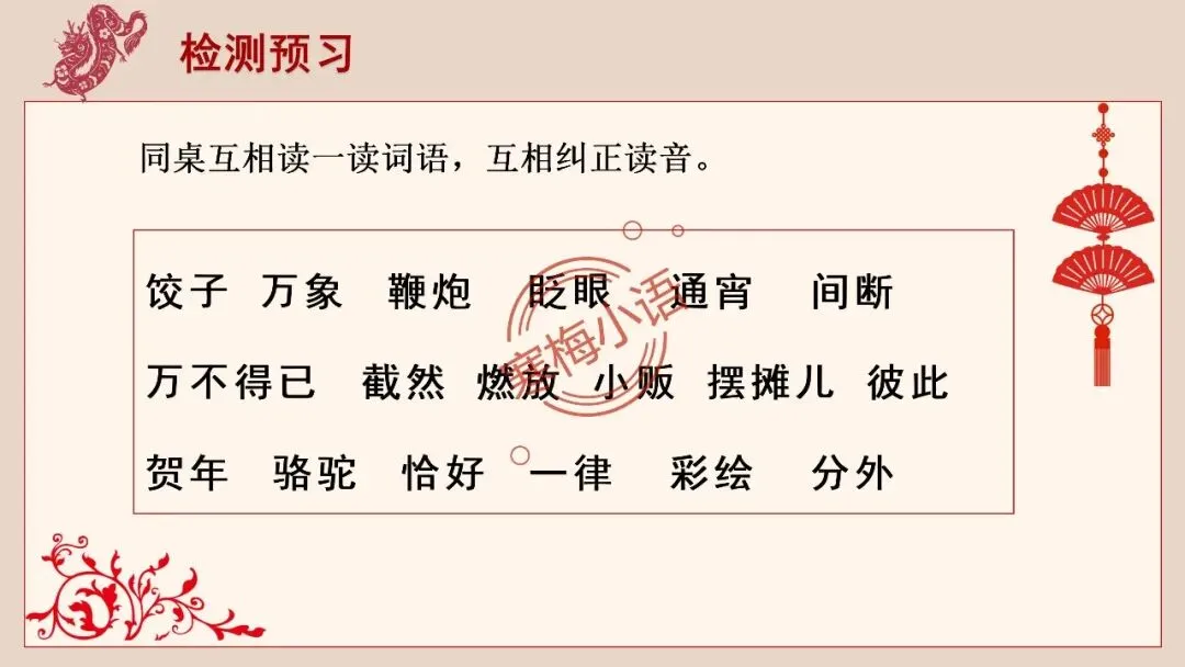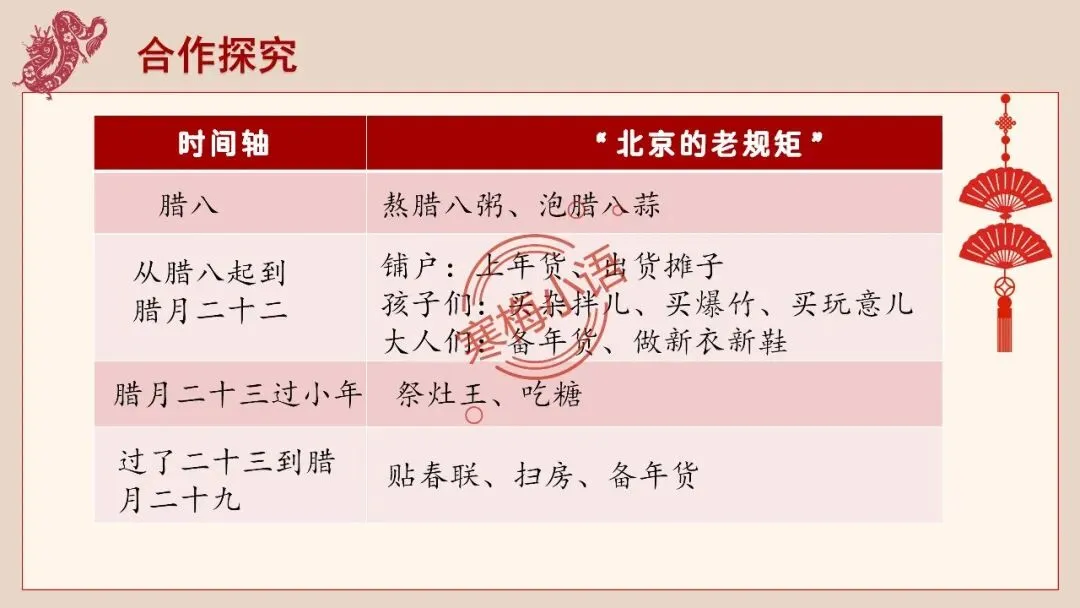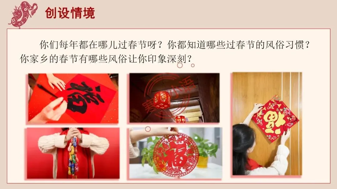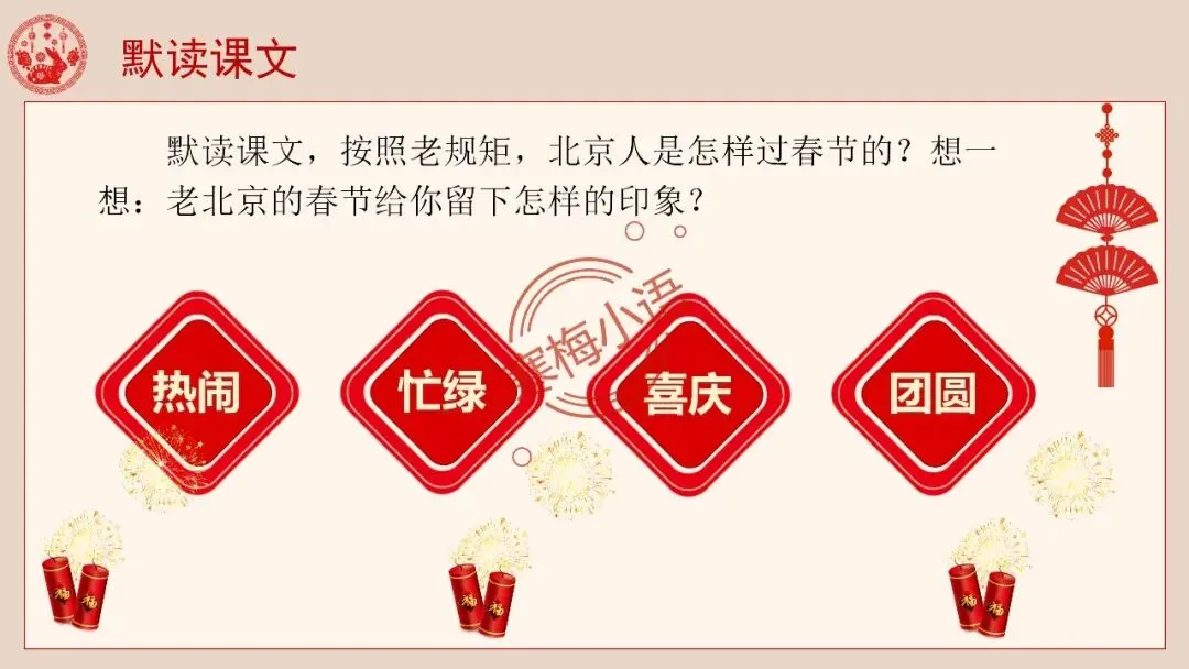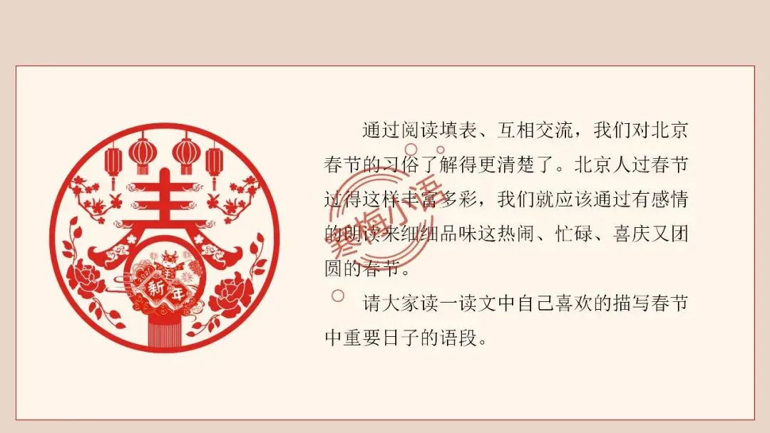 4.师:老舍先生也有一篇文章,写了老北京过春节的情景,就让我们一起走进北京的春节,感受京味十足的、独特的民风民俗的年文化吧。