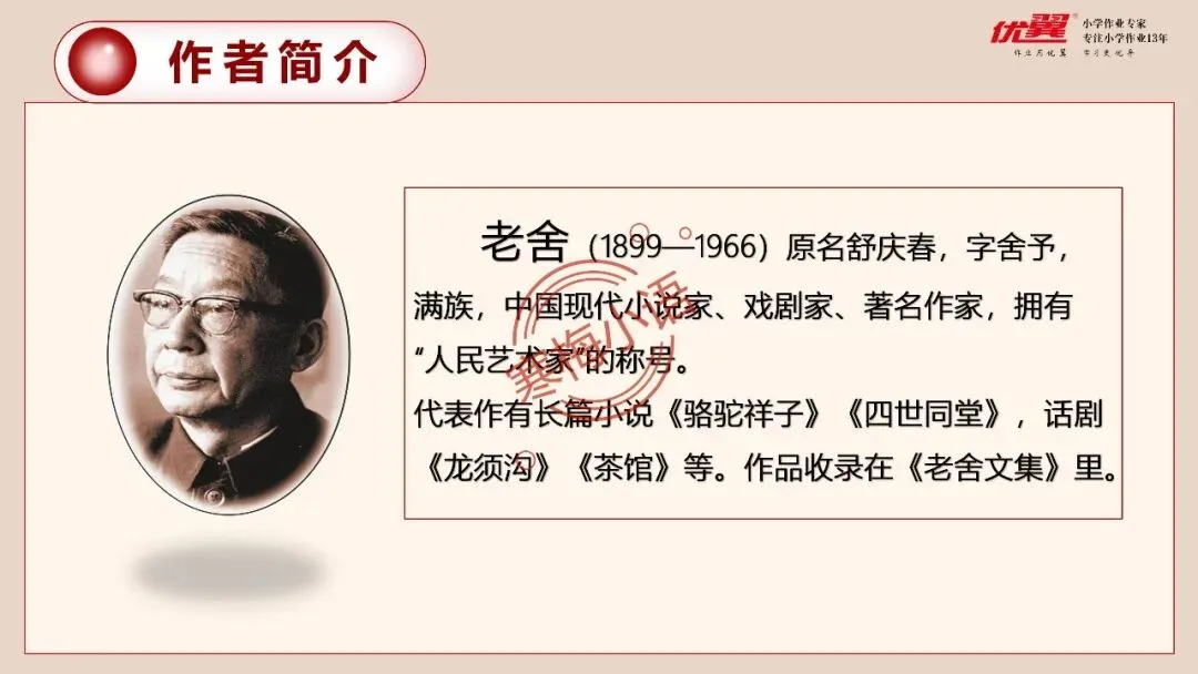老舍(1899—1966)原名舒庆春,字舍予,满族,中国现代小说家、戏剧家、著名作家,拥有“人民艺术家”的称号。