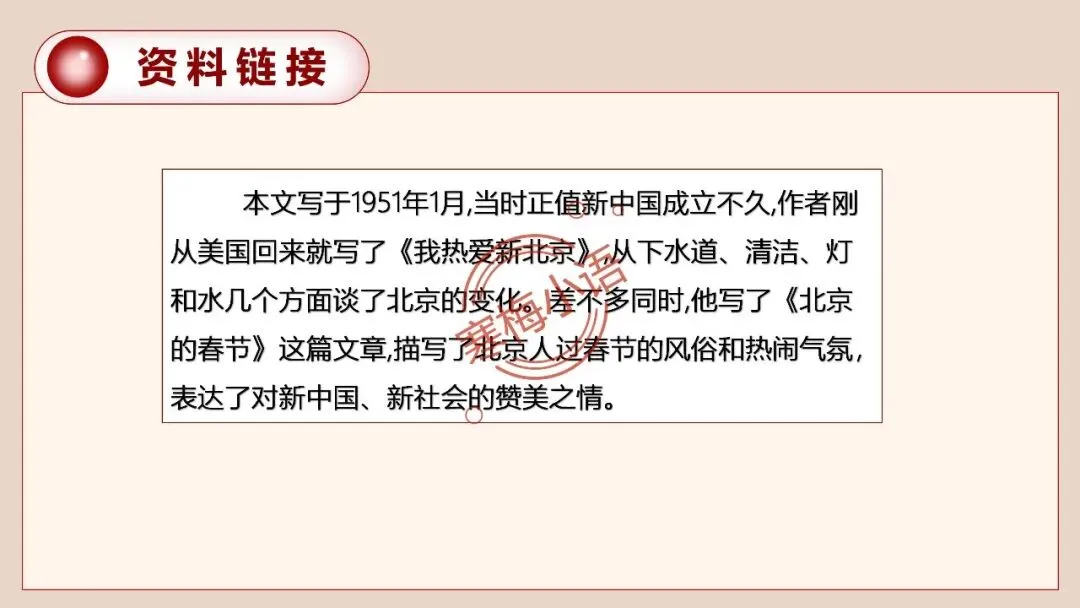资料链接:本文写于1951年1月,当时正值新中国成立不久,作者刚从美国回来就写了《我热爱新北京》,从下水道、清洁、灯和水几个方面谈了北京的变化。差不多同时,他写了《北京的春节》这篇文章,描写了北京人过春节的风俗和热闹气氛,表达了对新中国、新社会的赞美之情。