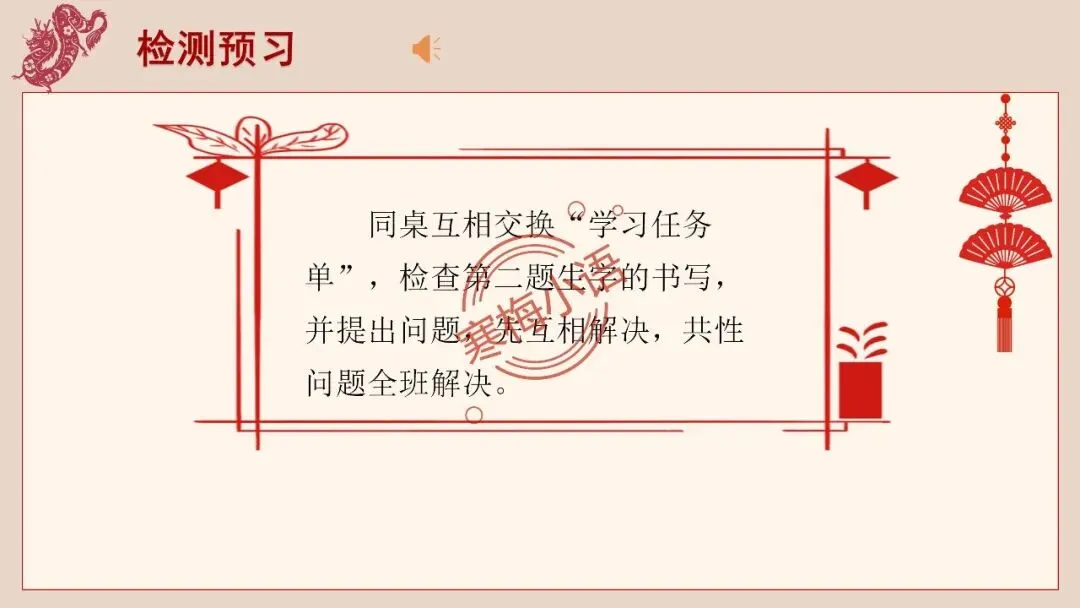 1.同桌互相交换“学习任务单”,检查第1题生字的书写,并提出问题,先互相解决,共性问题全班解决。