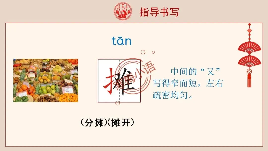重点指导:“摊”字是左中右结构,要注意中间的“又”写得窄而短,左右疏密均匀。“醋”字左边里面有一短横(一种调味品,起源于中国。古时用酒作为发酵剂酿制食醋,所以从“酉”。“燃”左右结构,不要写成上下结构。“火”比“然”略短,但不能写到“灬”的上方。)