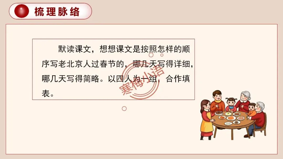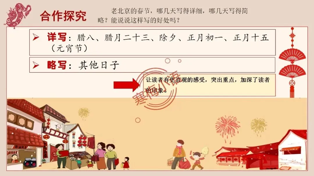 4.同学们已经对课文内容有了一定的了解,请你跟你小组的同学们一起讨论:这篇课文是按照什么顺序来写的?老北京的春节,哪几天写得详细,哪几天写得简略?能说说这样写的好处吗?