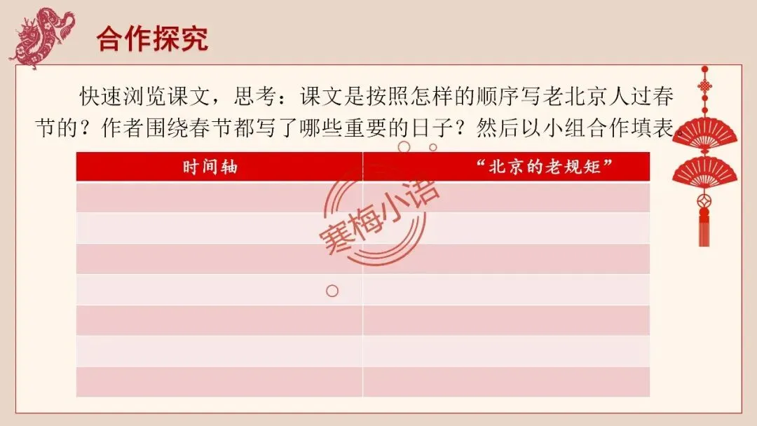 (出示学习要求)快速浏览课文,思考:课文是按照怎样的顺序写老北京人过春节的?作者围绕春节都写了哪些重要的日子?然后以小组合作填表。(学习任务单)