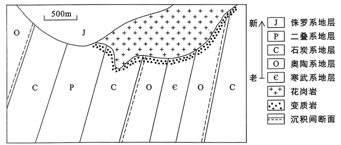 某地区位于华北板块中部,出露地层为:寒武系-奥陶系石灰岩,石炭系-二叠系砂岩、粉砂岩和页岩,侏罗系各类喷出岩。下图示意该地区不同地质时期形成的地层在地表出露情况。据此完成下面小题。