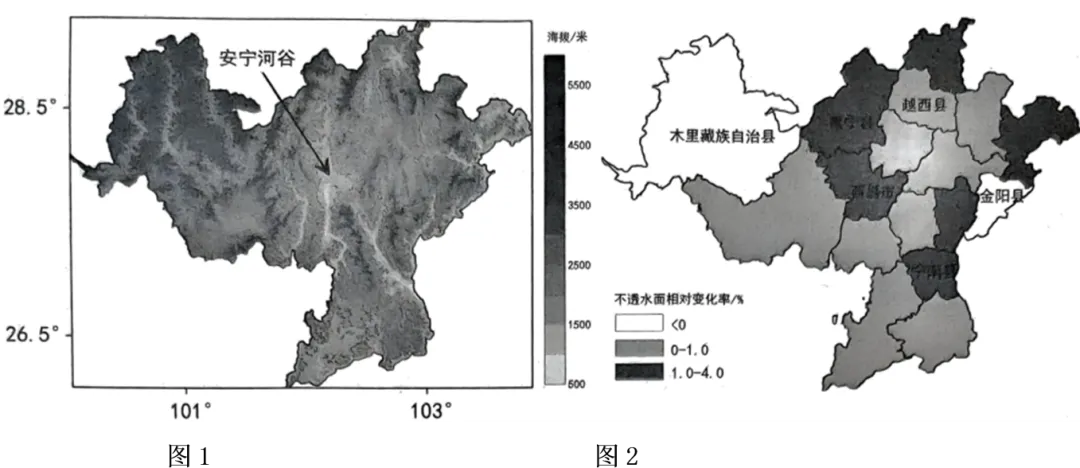 四川省凉山彝族自治州位于长江上游,地处川滇交界处,是国家扶贫、生态与人口统筹发展创新区。2000年以来,该区大量人口向具有更好生存生活条件的安宁河谷流域迁移。图1示意凉山州概况。图2示意凉山州不透水面相对变化率(反映建筑物、道路等硬质表面的变化速率)。据此完成下面小题。