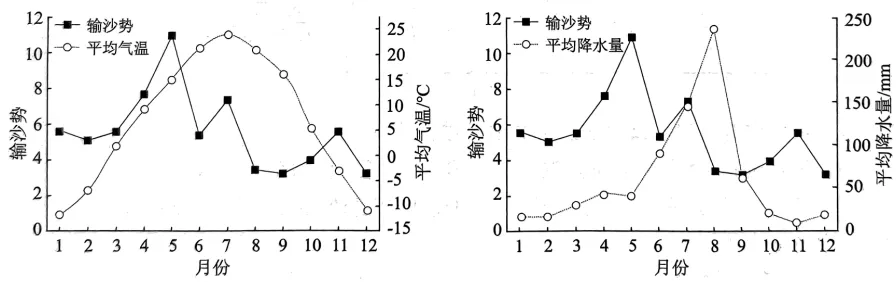 巴音温都尔沙漠是内蒙古西部扩张率最高的沙漠,地表沙物质全年向东输移,直接威胁整个河套平原的生态安全。人工防护林建设和飞机播种造林是巴音温都尔沙漠最常用的防风固沙措施。输沙势能够反映区域风沙活动强度。适当的风沙活动有利于种子自然覆沙。下图示意输沙势与月平均气温和降水量的年内变化关系。据此完成下面小题。