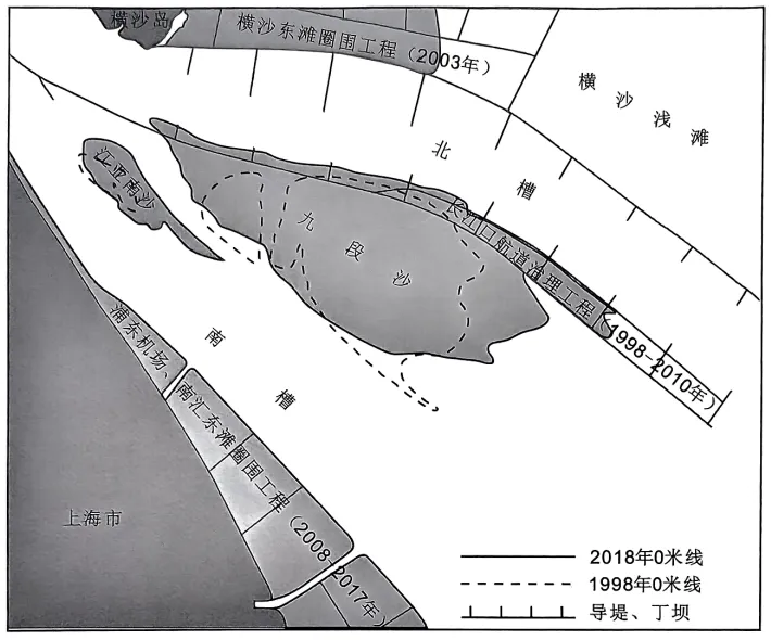 九段沙位于长江口第三级分汉河道南、北槽之间的拦门沙河段,是20世纪50年代开始形成的典型江心沙洲滩地。九段沙形成后至1998年,沙体总体表现为沙头冲刷、沙尾淤积,南侧淤积增高、北侧基本稳定,向东南延展的自然演化态势。1998年以来,受流域中上游水库建设、河口涉水工程(圈围工程、航道治理工程等)实施的影响,河道向窄、深方向发展。随着九段沙上植被的生长、演替和滩地淤积增高,两者形成了相互促进的良性循环。下图示意九段沙概况。