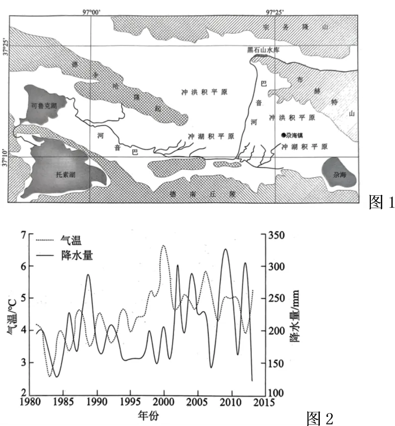 巴音河流域位于青藏高原柴达木盆地东北部,河流中下游流经冲洪积平原(地层为砂卵砾石与砂砾石等)和冲湖积平原(地层为细砂与黏土等)。2000年以来,在巴音河冲洪积扇前缘的尕海镇附近,地下水大范围溢出地表,致使该镇受灾严重。图1示意巴音河流域概况。图2示意该区域降水量和气温多年变化情况。