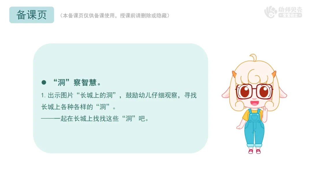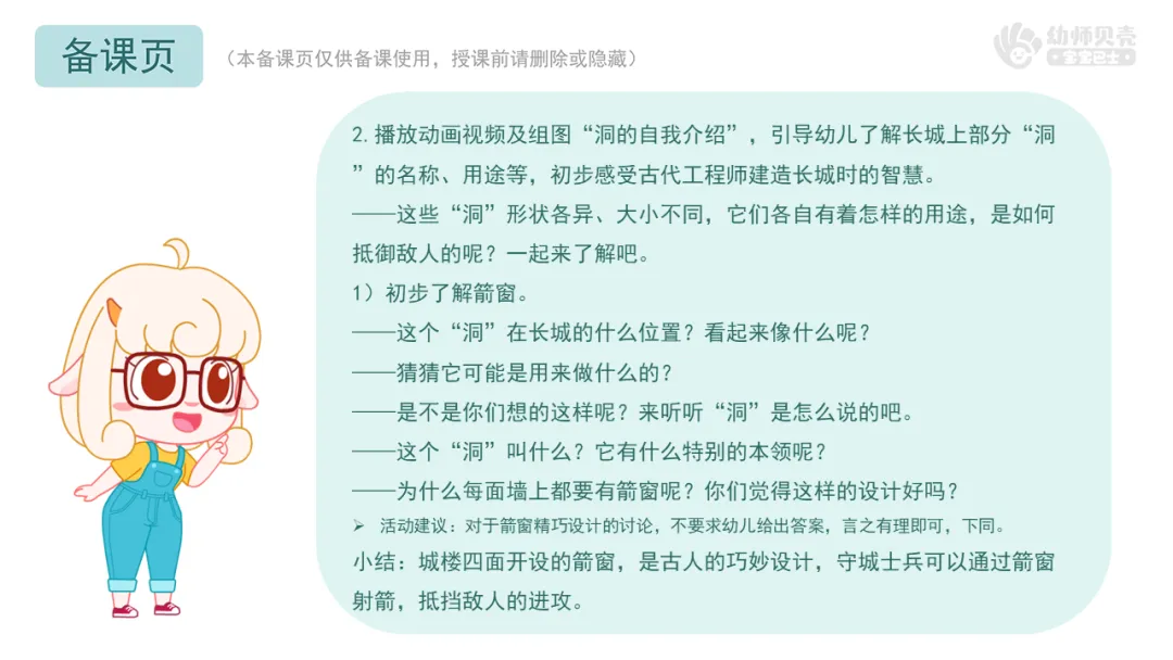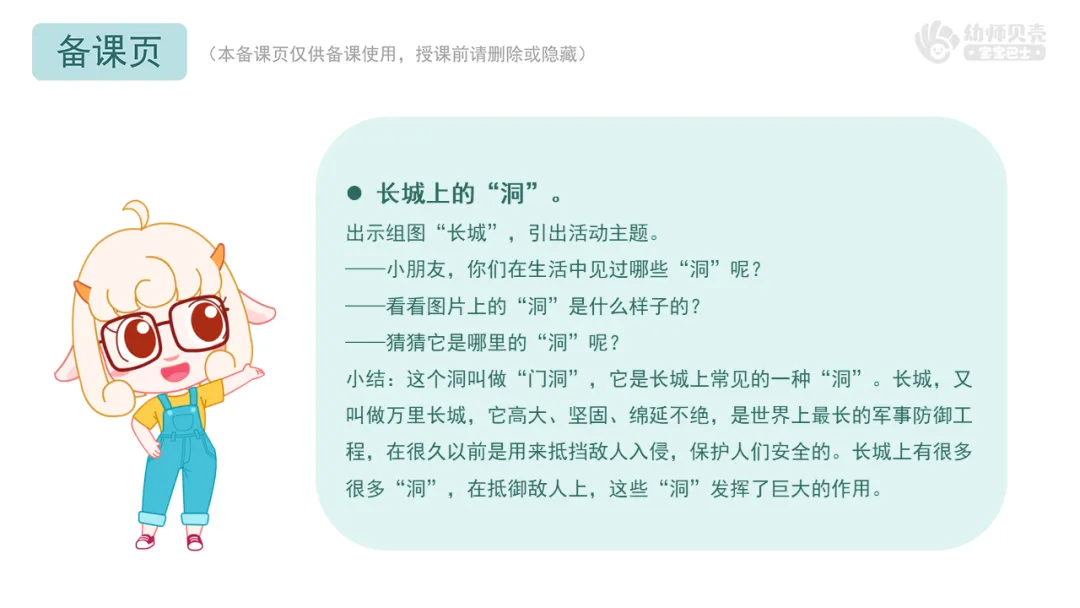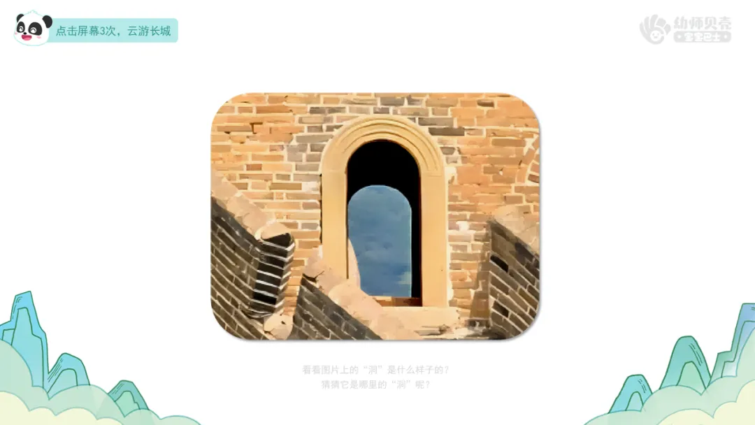 2.播放动画视频及组图“洞的自我介绍”,引导幼儿了解长城上部分“洞”的名称、用途等,初步感受古代工程师建造长城时的智慧。