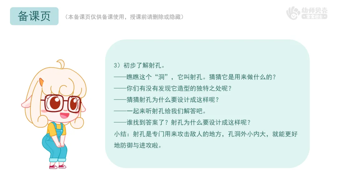 Ø活动建议:教师也可提前造好尖砖垛口样式的垛口墙,邀请1-2位幼儿用小木棍实际操作,感受垛口设计的巧妙之处。