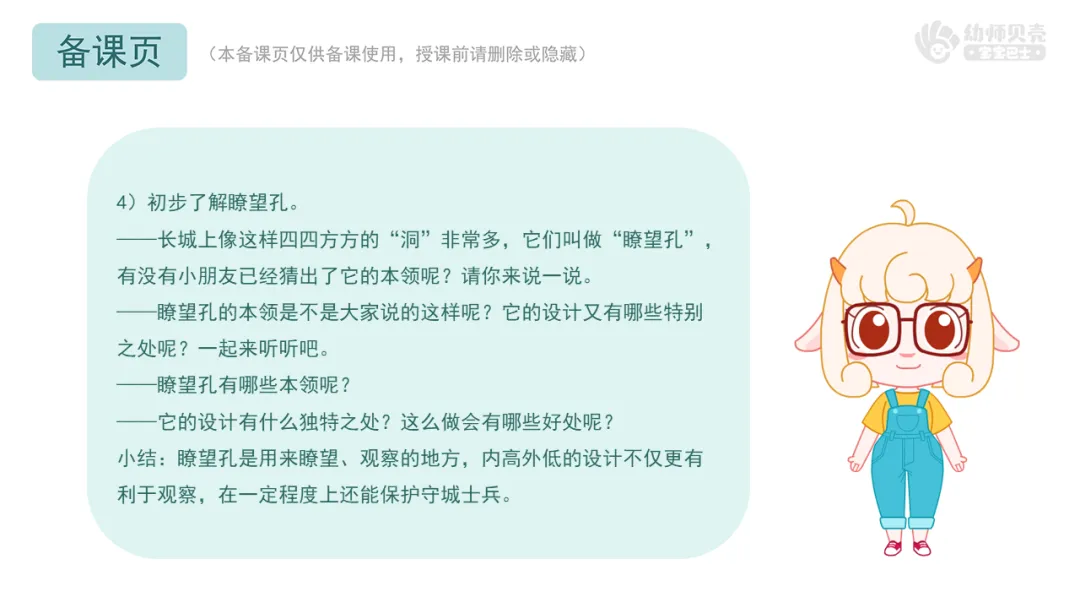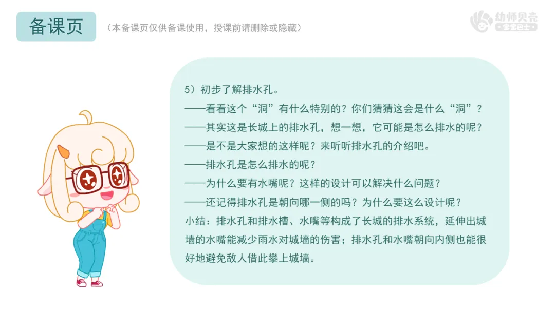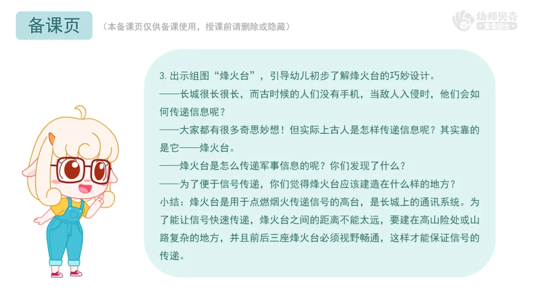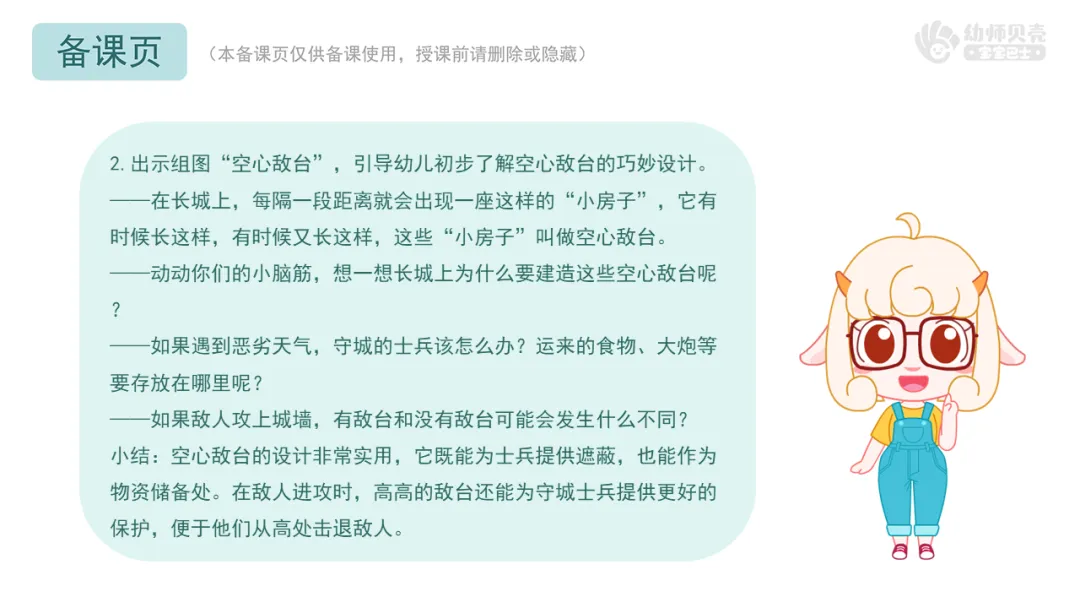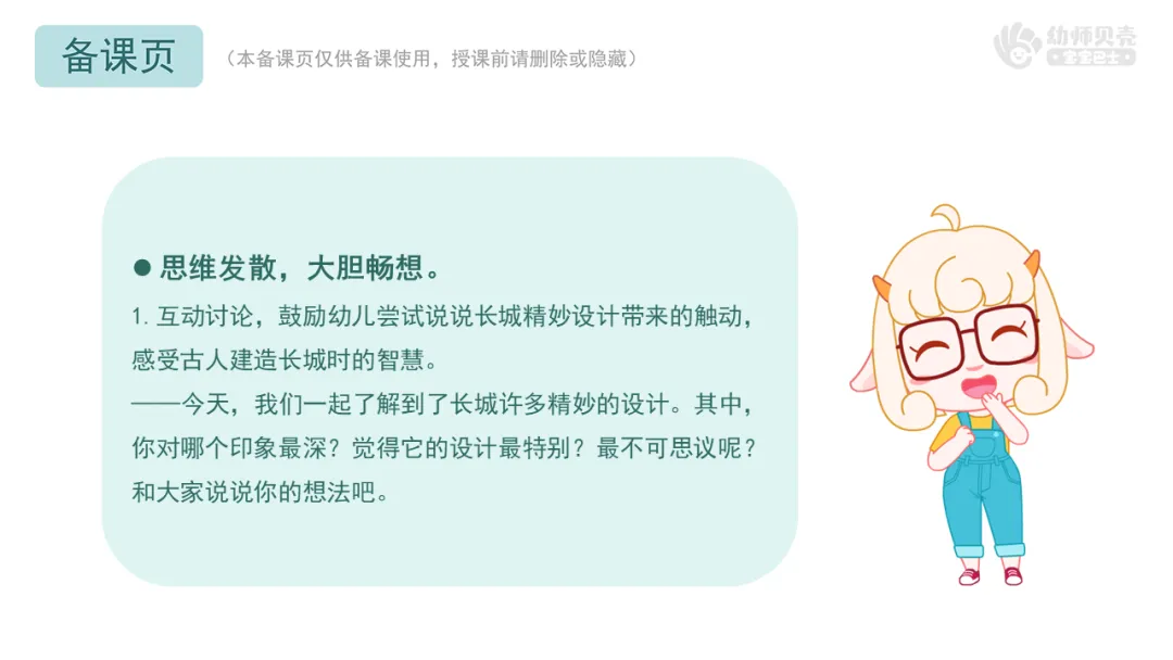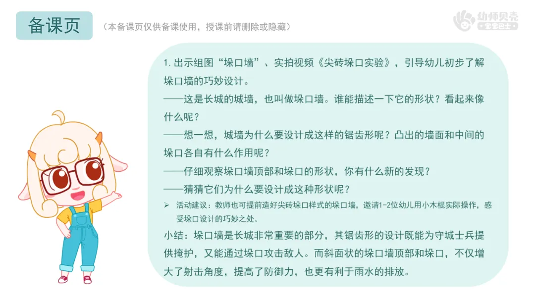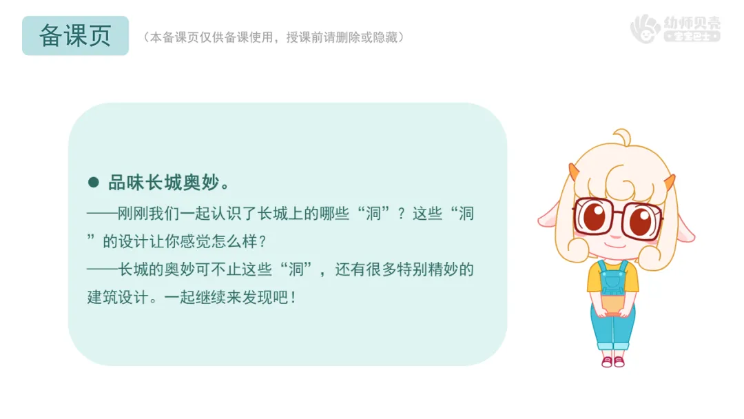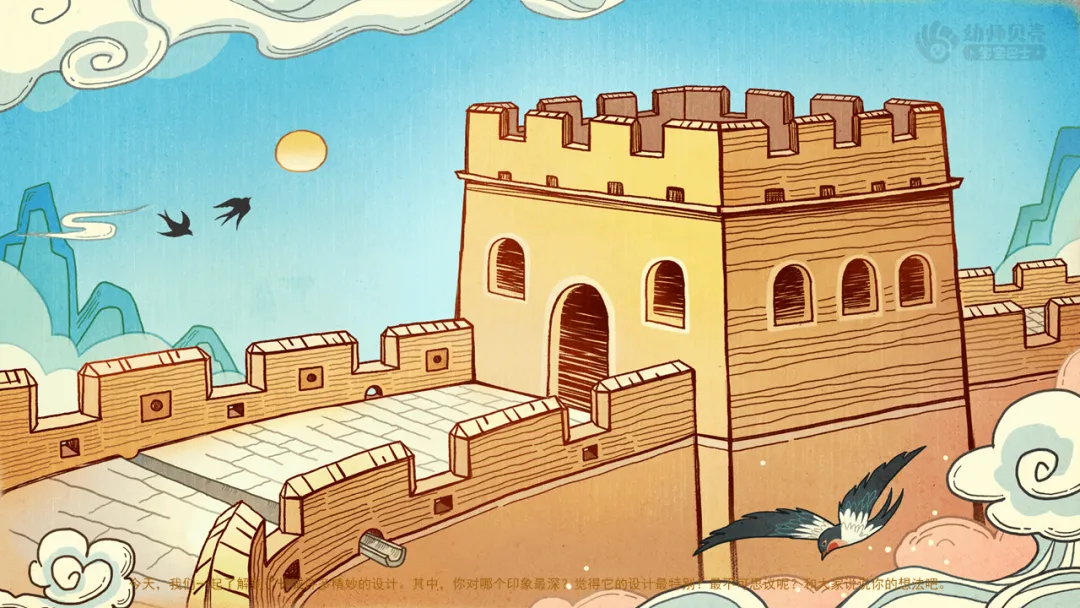 1.互动讨论,鼓励幼儿尝试说说长城精妙设计带来的触动,感受古人建造长城时的智慧。