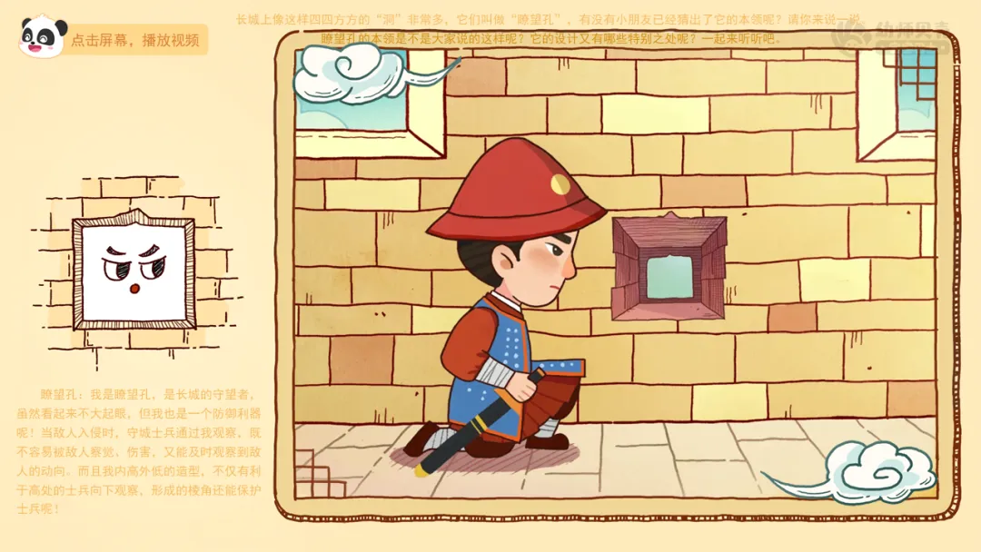 ——长城上像这样四四方方的“洞”非常多,它们叫做“瞭望孔”,有没有小朋友已经猜出了它的本领呢?请你来说一说。