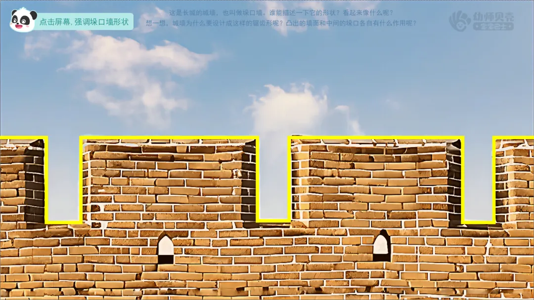 ——这是长城的城墙,也叫做垛口墙。谁能描述一下它的形状?看起来像什么呢?