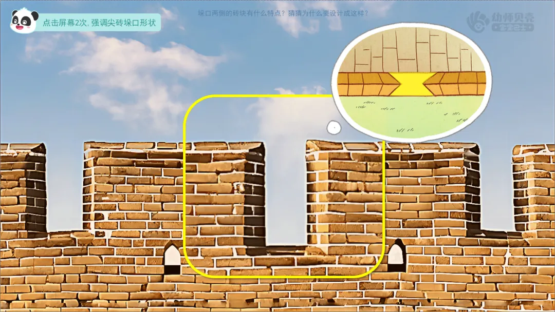 ——想一想,城墙为什么要设计成这样的锯齿形呢?凸出的墙面和中间的垛口各自有什么作用呢?