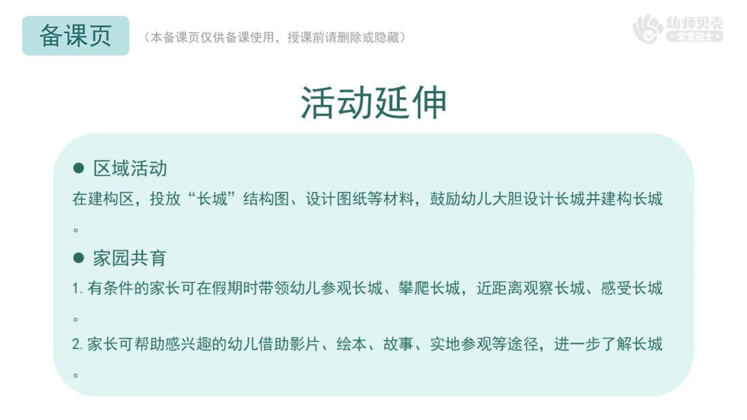 2.家长可帮助感兴趣的幼儿借助影片、绘本、故事、实地参观等途径,进一步了解长城。