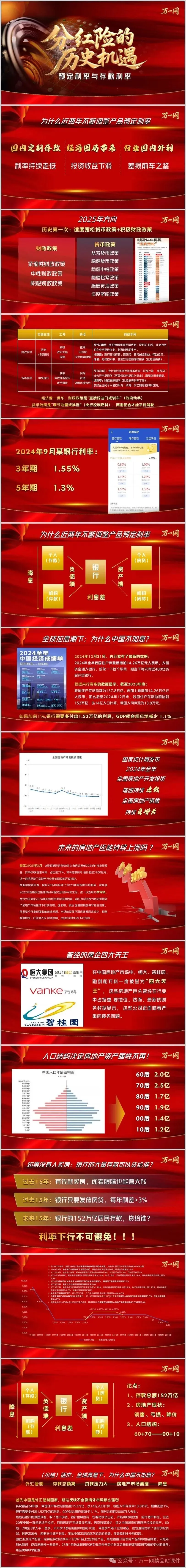 “再看政策,2025年国家要搞‘适度宽松货币政策+积极财政政策’,说白了就是‘多印钱、多花钱’刺激经济,但钱多了利率肯定更低。以前咱们说‘买房稳赚’,现在房企亏得底朝天,房子真不一定保值。那咱们的钱该放哪?总不能眼睁睁看着利息越来越少吧?”